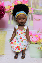 Куклы виниловые. Куклы представлены как в брендовой одежде так и без одежды, что позволяет самостоятельно создать для них неповторимый образ. Произведены в Испании из высококлассных материалов: пластмассы, текстиля. Глазки вставные, не закрываются. До мелочей проработано личико и тело. У всех кукол тонированы локти и колени. Волосы из нейлона, прошиты по всей голове, легко поддаются уходу. Ниже уровня роста волос нанесен оттиск Vestida de Azul, подтверждающий оригинальность куклы.